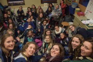 Nous sommes donc rentrées toutes victorieuses de cette épreuve de coopération et avons pu nous réchauffer à l’intérieur accompagnés d’un petit gouter des Perroquets. Un petit chant d’anniversaire, un de plus 😉 pour l’anniversaire de Tamia et nous avons vite réchauffé nos voix et nos mains. La réunion s’est terminée dans le local où nous avons fait un rassemblement tout à fait exceptionnel: nous étions assises!