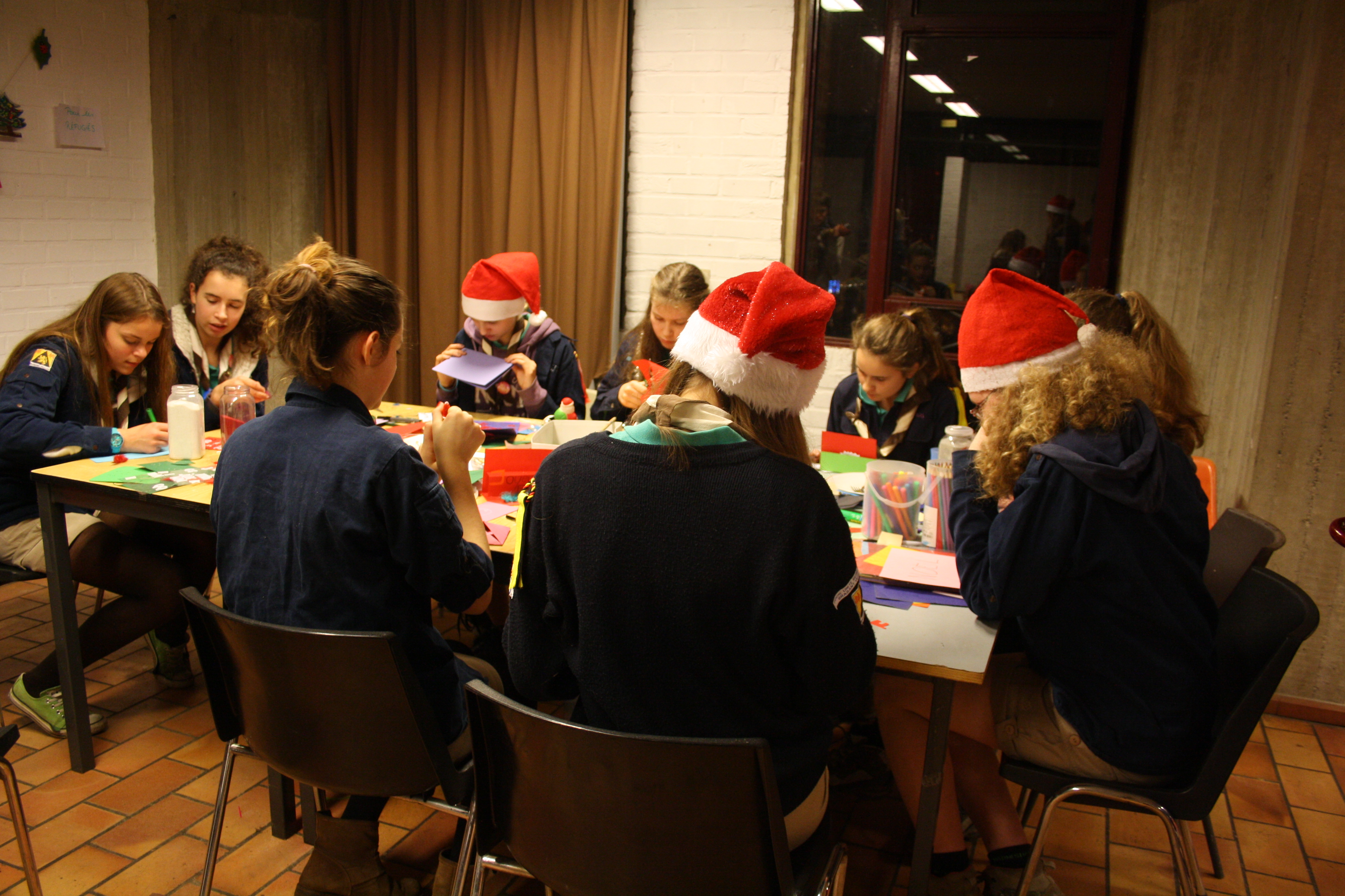 Ce mercredi soir, nous nous sommes retrouvées pour passer ensemble une veillée de Noël : rien de mieux pour se détendre après les examens et pour commencer les vacances en beauté ! Comme c’était quasi Noël, nous avons fait un… CASINOEL ! Mais ce n’était pas un simple casino : la salle était divisée en plein de stands où on pouvait jouer à différents jeux de société (jenga, time’s up, qui est-ce Cassiopée, …). Il y avait également un stand où les guides pouvaient faire une carte de Noël pour des prisonniers ou pour des enfants réfugiés. Entre temps, nous avons pu déguster d’excellentes quiches et salades de pâtes préparées avec amour par les guides : c’était encore meilleur qu’un concours cuisine ! Et les desserts… un vrai délice ! Enfin nous nous sommes rassemblées en cercle pour faire la distribution des cadeaux : tout le monde avait reçu à l’avance le nom de la personne à qui offrir son cadeau. Le thème des cadeaux de cette année était…. » Made in Belgium » ! Eh oui, on a vu beaucoup de chocolat surgir des papiers cadeaux !! :p L’échange de cadeaux s’est fait de manière assez originale : des lettres étaient sifflées en morse et, dès qu’on reconnaissait la première lettre du totem ou du prénom de la guide à qui offrir son cadeau, on pouvait aller lui donner.