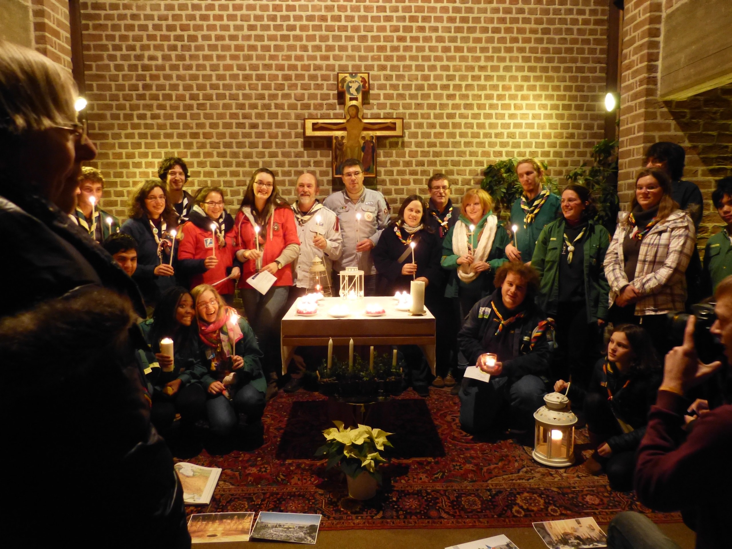 Ce dimanche soir, la lumière de la Paix de Bethléem est arrivée à Louvain-la-Neuve. Cette lumière, partie de la grotte de la nativité, va alors être diffusée partout dans le monde notamment grâce à nous, les guides et les scouts. Maki était donc présente à la veillée de prière autour de la flamme, afin de représenter Cassiopée. Cette flamme sera toujours là mercredi pour la veillée de Noël et nous proposons donc à celles qui veulent d’amener une bougie (et éventuellement de quoi la protéger) afin de ramener la flamme chez elles et ainsi continuer à la partager.